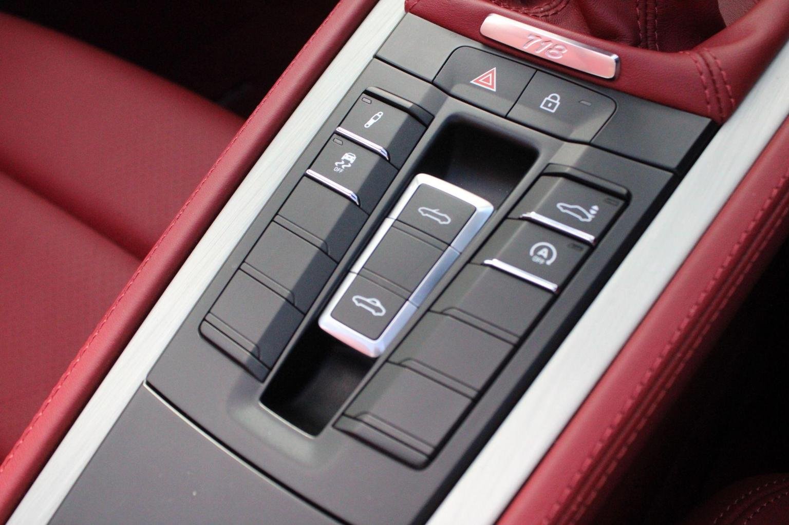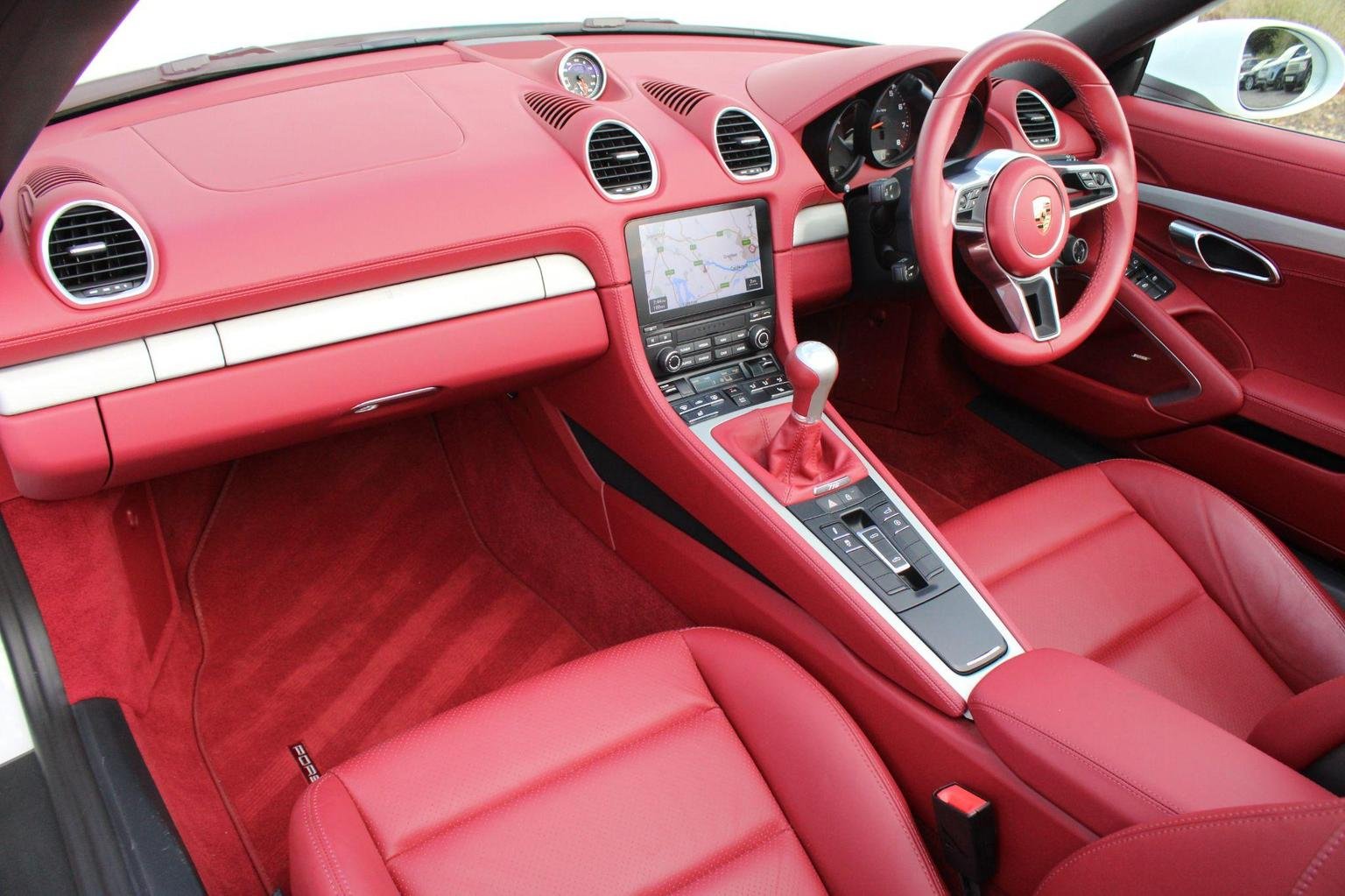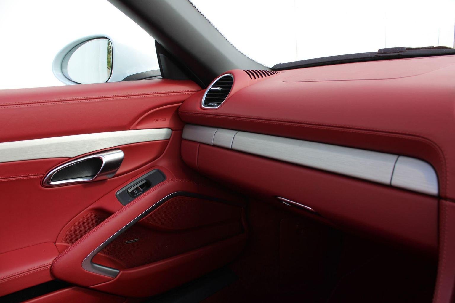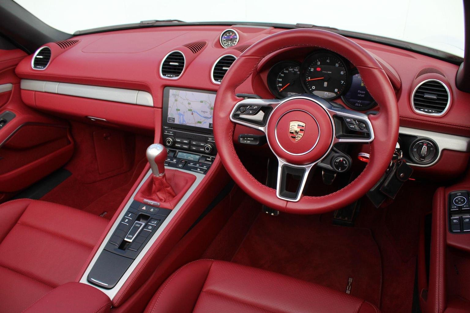 Porsche Torque Vectoring - PTV with Mechanically Locking Rear Differential, 64 Litre Fuel Tank, PASM - Porsche Active Suspension Management with Ride Height Lowered by 10mm, Heated Multifunction Steering Wheel, Smoking Package, Light Design Package, LED Main Headlights including Porsche Dynamic Light System - PDLS, Interior Package - Brushed Aluminium - with Leather Interior, Sports Seats Plus - Electrical 2 Way, Automatically Dimming Mirrors with Integrated Rain Sensor, BOSE Surround Sound System, ParkAssist - Front and Rear with Reversing Camera, Seat Belts - Silver Grey, Porsche Crest on Head Restraints, Leather with Leather Interior - Bordeaux Red, 718 Logo, Convertible Top Colour - Red, Electrically Folding Exterior Mirrors, Roll-Over Bars Painted in Exterior Colour, Vehicle Key Painted with Key Pouch in Leather, 18in Alloy Wheels - Cayman