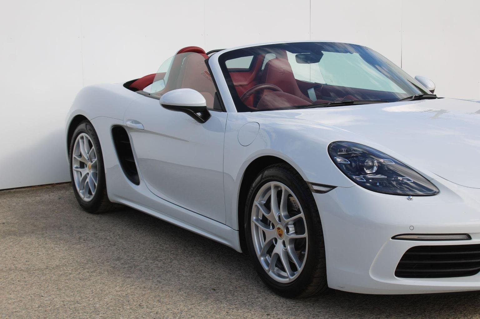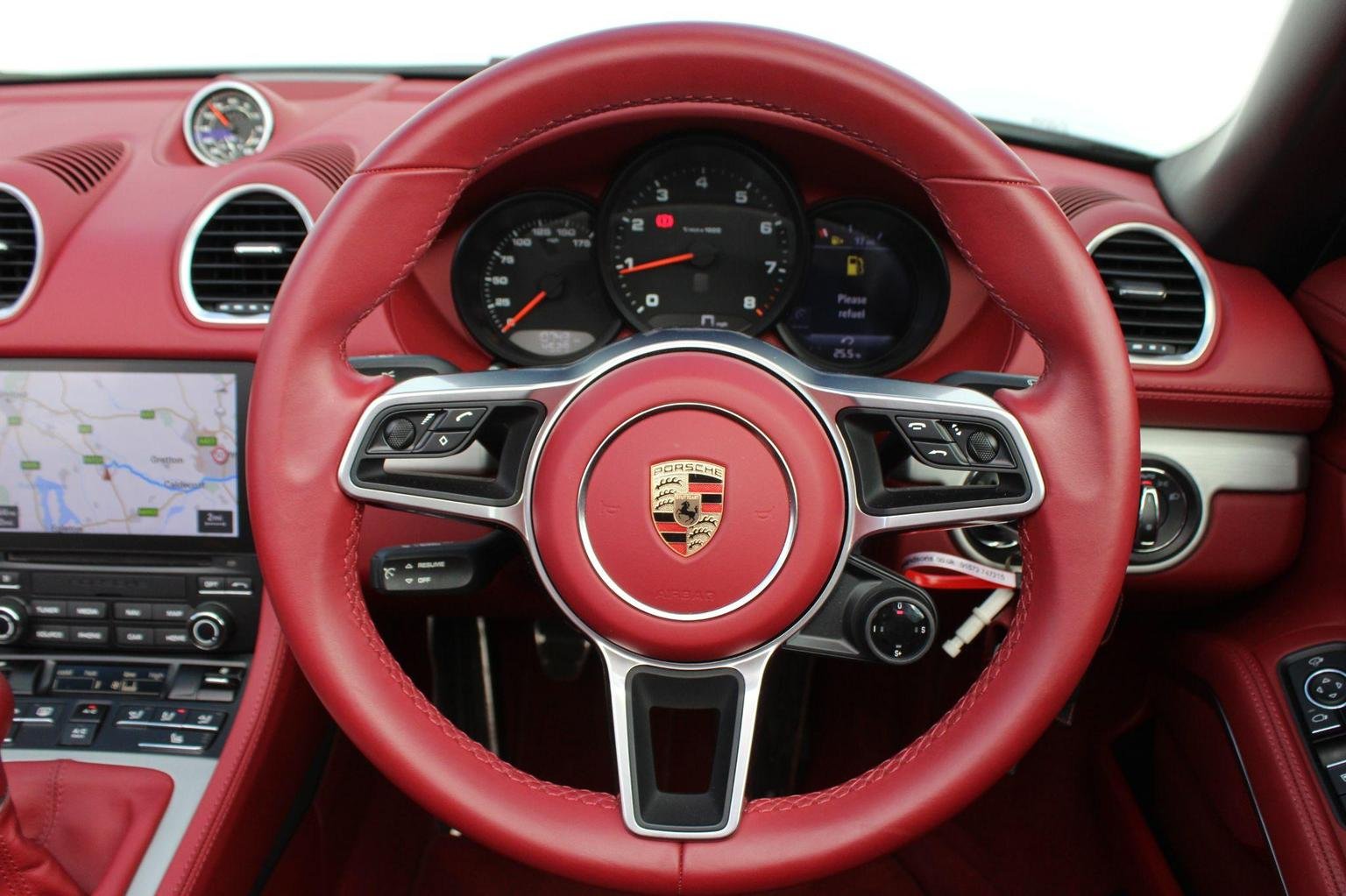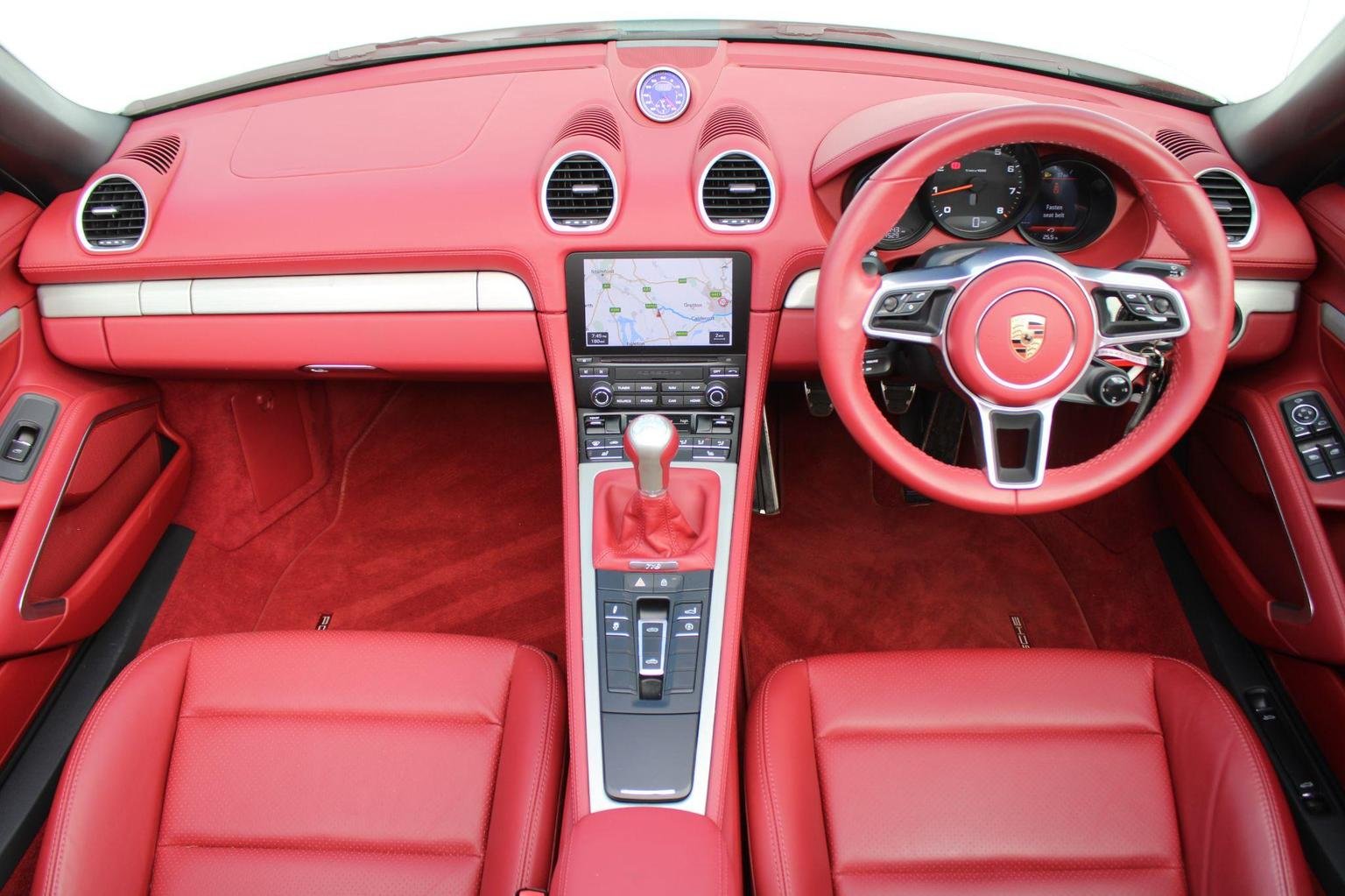 Porsche Torque Vectoring - PTV with Mechanically Locking Rear Differential, 64 Litre Fuel Tank, PASM - Porsche Active Suspension Management with Ride Height Lowered by 10mm, Heated Multifunction Steering Wheel, Smoking Package, Light Design Package, LED Main Headlights including Porsche Dynamic Light System - PDLS, Interior Package - Brushed Aluminium - with Leather Interior, Sports Seats Plus - Electrical 2 Way, Automatically Dimming Mirrors with Integrated Rain Sensor, BOSE Surround Sound System, ParkAssist - Front and Rear with Reversing Camera, Seat Belts - Silver Grey, Porsche Crest on Head Restraints, Leather with Leather Interior - Bordeaux Red, 718 Logo, Convertible Top Colour - Red, Electrically Folding Exterior Mirrors, Roll-Over Bars Painted in Exterior Colour, Vehicle Key Painted with Key Pouch in Leather, 18in Alloy Wheels - Cayman